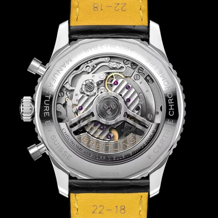 Beneath the surface beats the high-performance Breitling Manufacture Caliber B01 — an in-house, COSC-certified movement boasting a 70-hour power reserve, column wheel, and vertical clutch. This engine ensures exceptional chronograph accuracy and long-term reliability.