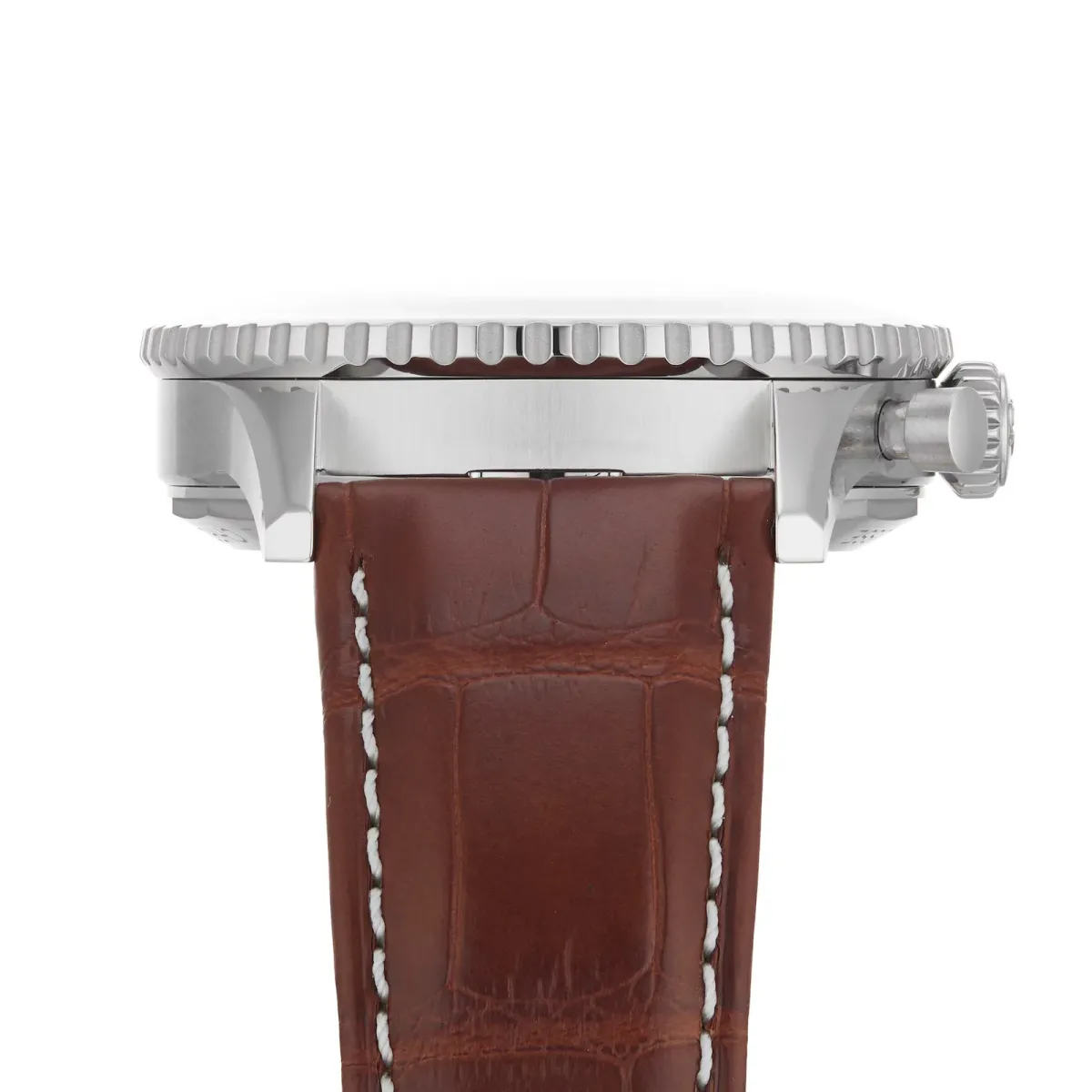 The rich brown alligator leather strap, secured with a deployant clasp, adds a layer of sophistication, ensuring the watch sits comfortably and stylishly on the wrist. Pristine from the domed sapphire crystal, all the way to its 30-meter water resistance and moderate thickness of 13.6 mm, this Navitimer is a seamless convergence of form, function, and legacy.