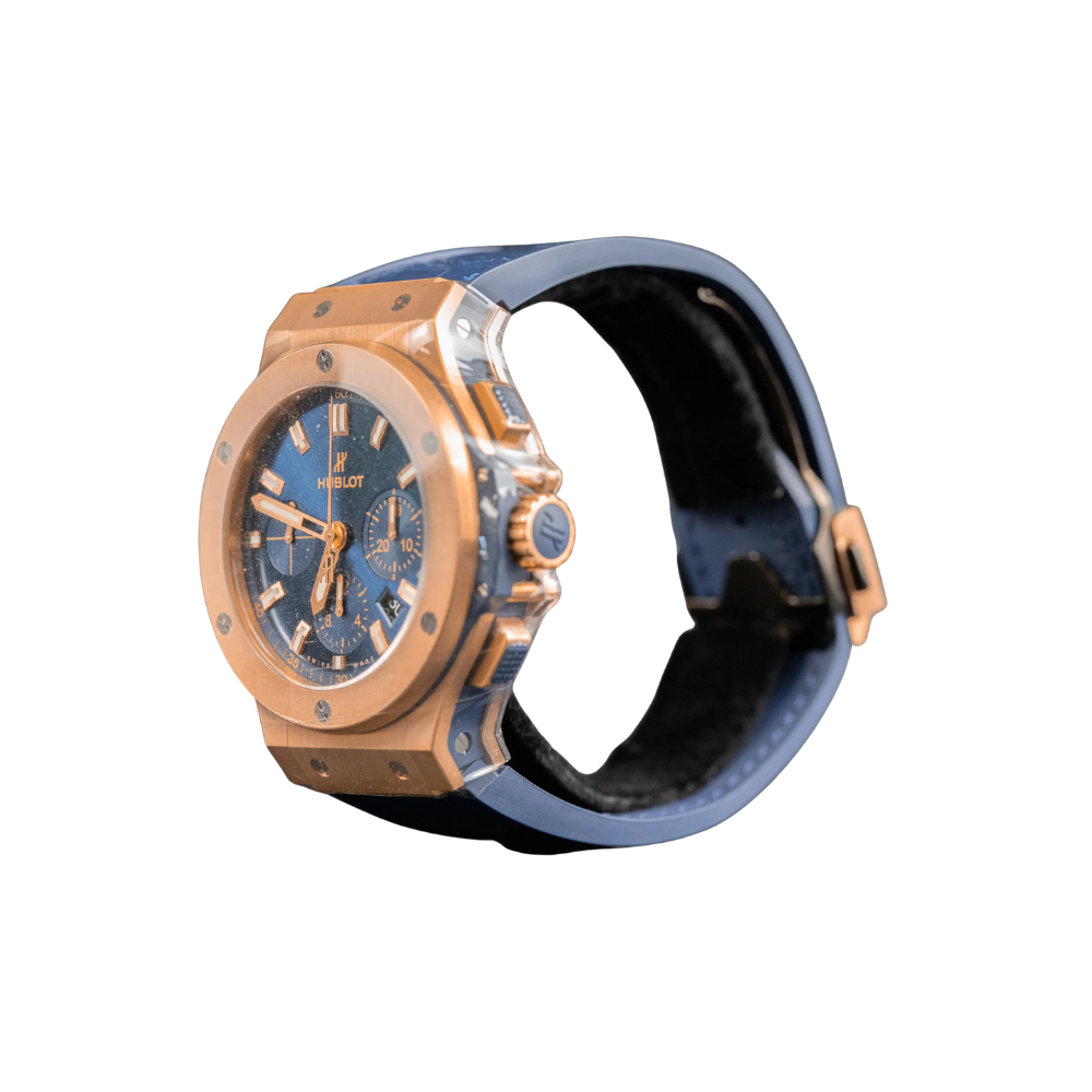 Powered by the Hublot HUB4100 self-winding chronograph movement, the watch delivers precision, reliability, and a 42-hour power reserve. The sapphire case back reveals the finely finished movement, while the signature porthole-inspired case construction reinforces the Big Bang’s iconic presence.