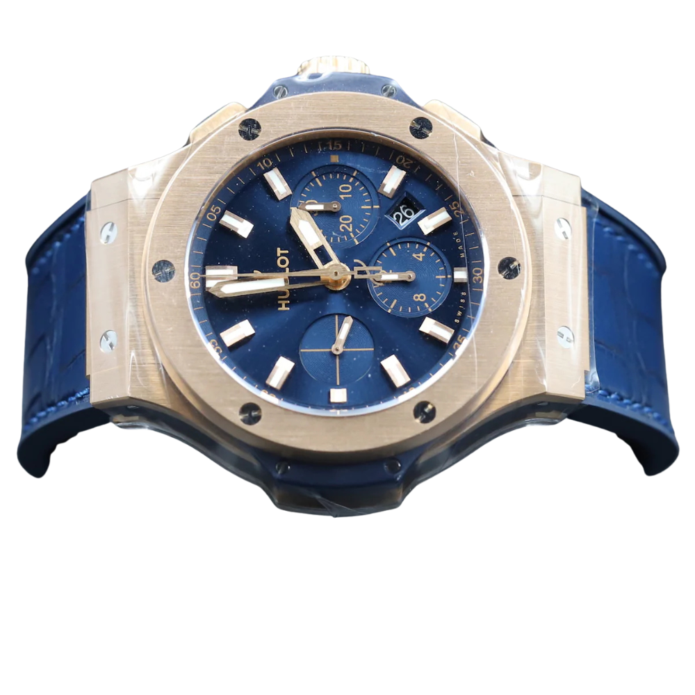 The Hublot Big Bang Gold Blue Ref. 301.PX.7180.LR embodies the perfect fusion of sportiness, luxury, and bold design. Crafted in 18K polished and satin-finished rose gold, this 44mm chronograph makes a powerful statement, enhanced by its striking blue sunray dial and matching alligator leather strap with rubber lining.