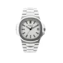The Patek Philippe Nautilus 5711/1A-011 is a rare and highly sought-after luxury sports watch, celebrated for its clean, minimalist design and timeless elegance. This 2017 edition features a 40mm stainless steel case with a classic silvery white dial, setting it apart from the more common blue-dial version.