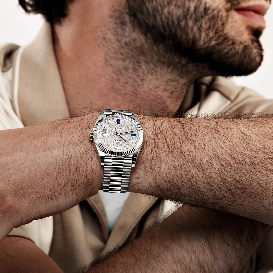 - Dial: Exquisite pavé diamond dial with meticulously set brilliant-cut diamonds; day aperture at 12 o’clock and date window at 3 o’clock beneath the Cyclops lens.