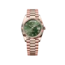 The Rolex Day-Date 40 Ref. 228235-0025 in Everose gold with an olive-green dial is a masterpiece of refinement. The patented Everose alloy preserves the beauty of its rose hue, ensuring lasting brilliance, while the fluted bezel underscores Rolex’s signature aesthetic. The olive-green dial, enhanced by its sunray finish, reflects subtle tones depending on the light, creating a captivating visual effect.