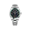 This reference features a 40mm Oyster case in robust 904L Oystersteel, paired with a solid-link Oyster bracelet for durability and comfort. Its defining feature is the exclusive green sapphire crystal (GV – Glace Verte), unique to the Milgauss line, which gives the watch its unmistakable identity.