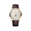 The Vacheron Complete Calendar 4010T/000R-B344 embodies timeless sophistication with its stepped 41mm case in 18K pink gold, fluted caseback, and railway minute-track. Its elegant silver-toned opaline dial integrates day and month apertures with a central date pointer, while a meticulously detailed moon phase display at 6 o’clock adds a poetic touch. This timepiece perfectly balances traditional aesthetics and fine Swiss craftsmanship.